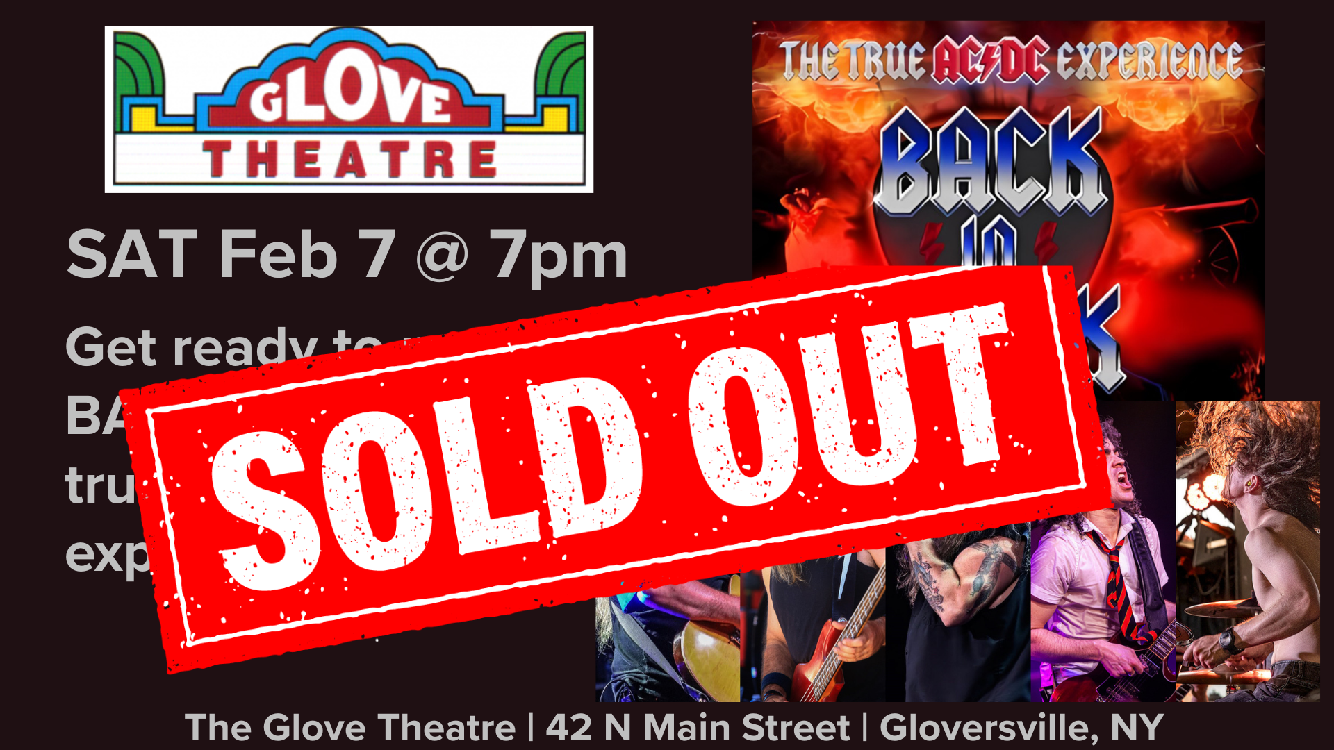 The Glove Theatre & E1 PRESENTS proudly welcome BACK IN BLACK: AC/DC Tribute to The Glove stage!
